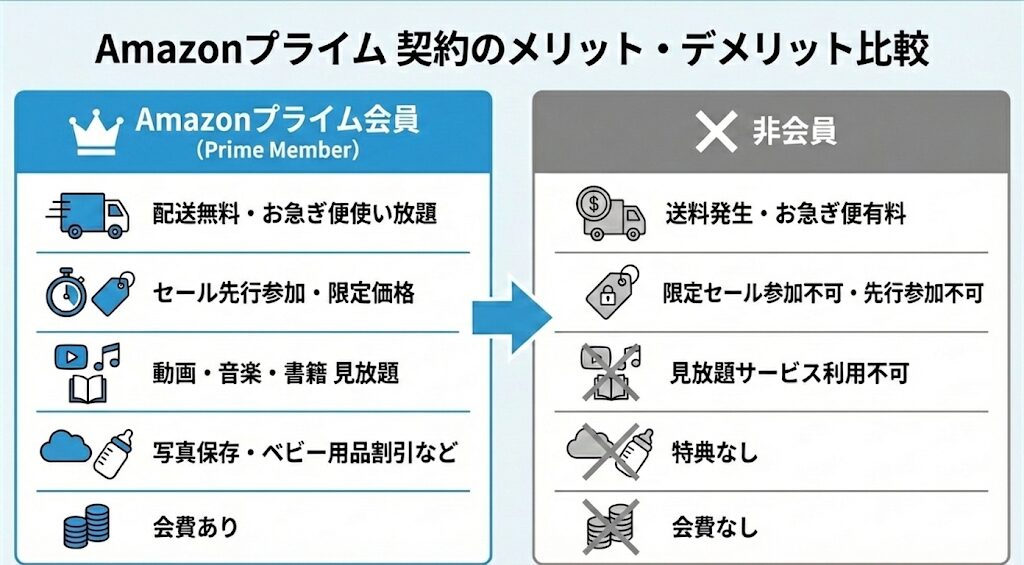 Amazonプライムは、通常Amazonでの配送料が無料かつ届くスピードが早くなる特典と合わせて、動画・音楽・本などのデジタル特典がセットになった月会員制サブスクサービスです。