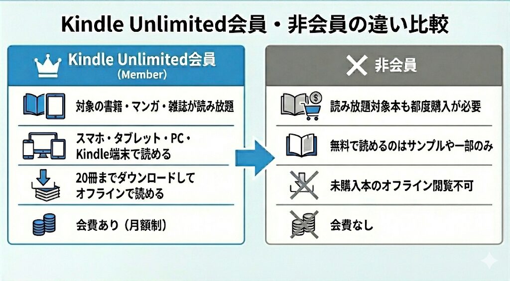 | Prime Reading(プライム特典) | 約1,000冊以上 | プライム会員なら追加料金なし。厳選された小説・漫画・雑誌が中心で、ラインナップは定期更新。 |