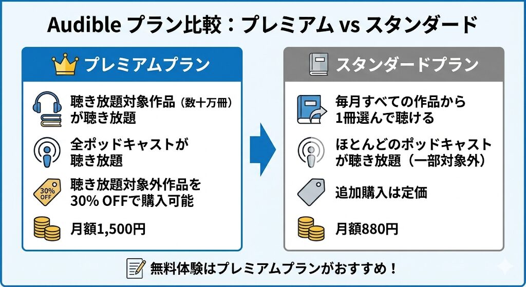 プレミアムプランは月額1,500円で数十万作品が聴き放題なのに対し、
