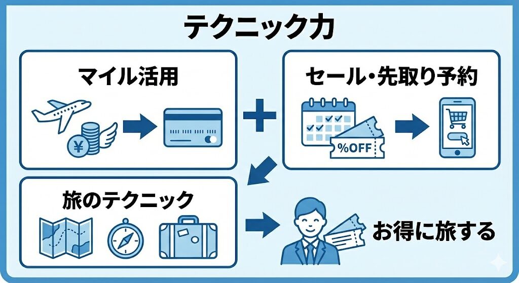 テクニック・・マイルやセールや予約の先取りなど旅のテクニック力