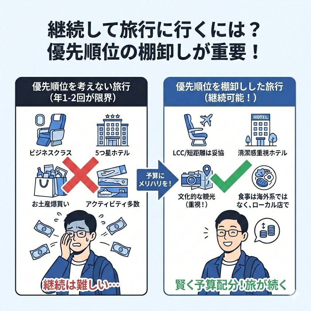 優先順位を考えずに旅をするのであれば、年1とか2とかなら良いと思いますが、継続して旅行に行くのは難しいかと思います。